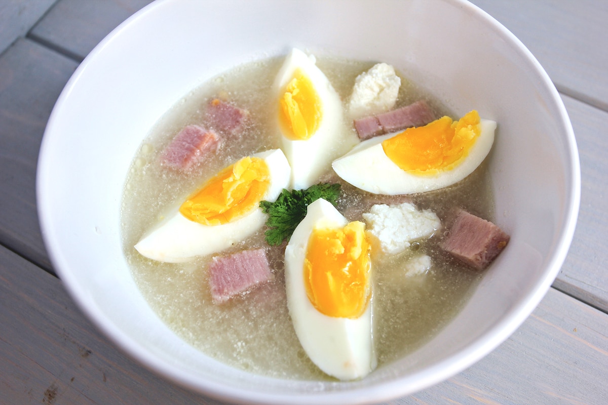 Serwujemy czystą zupę, a dodatki czyli jajka na twardo, biały ser i szynkę podajemy osobno. W ten sposób każdy dobiera sobie ilość dodatków w zależności od preferencji.